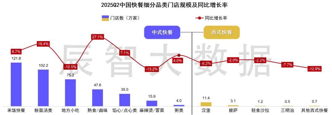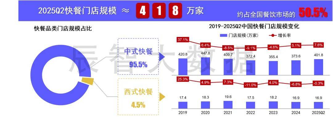 截止2025Q2,我国快餐赛道门店规模约418万家,其中,中式快餐约401.8万家,西式快餐约16.9万家,两者约占全国餐饮市场的 50.5%。