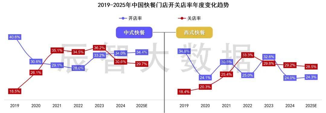 2024年-2025上半年,中式快餐开店率高于关店率,展现出强大的活力;西式快餐价格战导致市场陷入低迷,开店率暴跌至关店率以下,进入结构调整期。