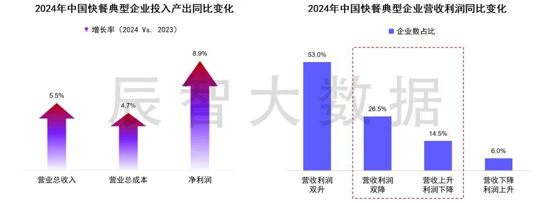 2024年快餐典型企业整体发展稳中向好,约2/3企业营收实现增长,营业总收入同比增长5.5%,基于良好的成本把控,营业总成本的同比增速低于收入增速,净利润也实现了同比增长。
