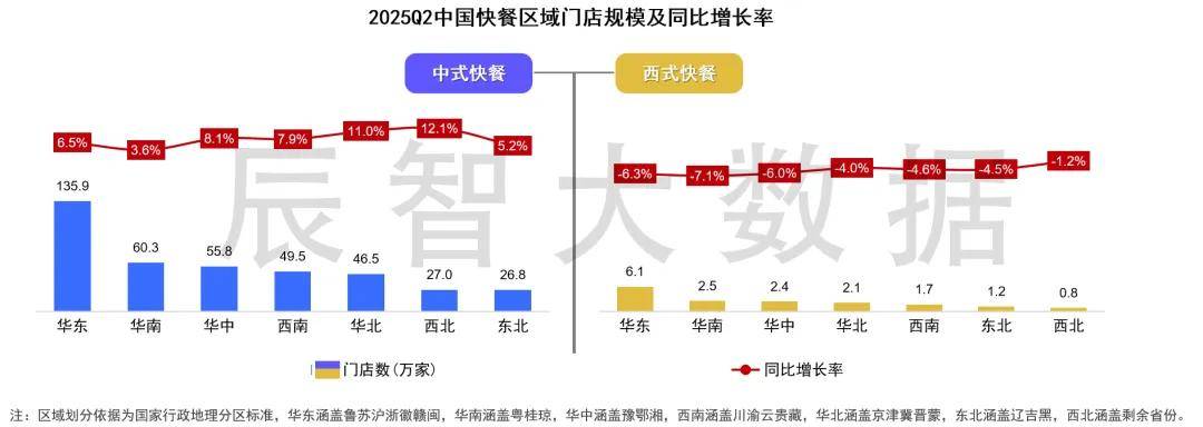 分区域来看,无论是中式快餐还是西式快餐,门店都最多聚集在经济最发达的华东区域,其次是华南与华中区域,西北与东北区域门店数都明显少于其他区域。
