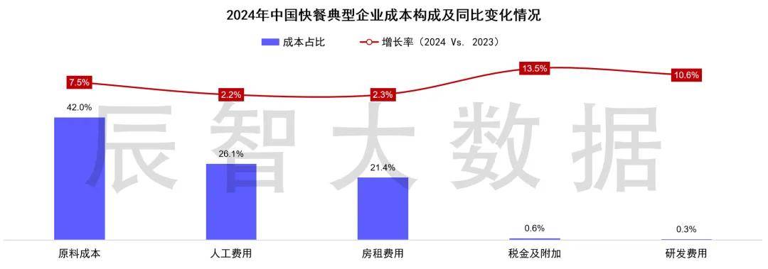 2024年快餐典型企业成本构成中,原料成本是其最大支出项,占比超40%,其次是人工与房租费用;三项成本占总成本近九成,而且这三项同比均在升高,三高问题始终是困扰快餐企业盈利的大问题,精细化、数字化成本管理迫在眉睫。
