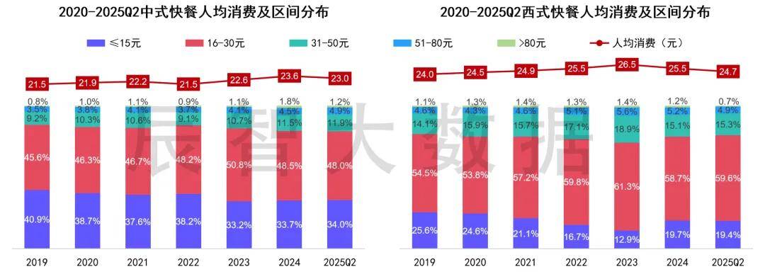 随着我国目前经济增速放缓、人口老龄化加速,消费者日趋理性和务实,餐饮消费开始追求极致性价比,从消费区间分布来看,近2年中式快餐呈现K形分布特点(≤15元与30元区间占比升高),近2年西式快餐受市场价格战影响≤30元区间占比持续提升,反映出市场消费更审慎但又不愿放弃品质的理念,消费者不再将目光聚焦单一价格,而是更强调品质与价格的平衡。