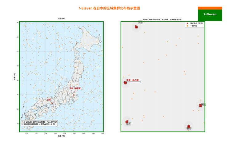 7-Eleven便利店在日本市场的布局堪称区域集群化的经典范例。在东京都心的某些商圈,经常出现“百米之内三家7-Eleven”的奇特景象。这种看似违背常理的高密度布局,实则蕴含着精妙的商业逻辑。通过提高门店密度集中开店,7-Eleven实现了物流配送的极致优化,单店配送成本降低35%以上;同时形成了强大的品牌曝光效应,消费者在任何角落都能看到熟悉的橙绿招牌,潜移默化中建立了品牌忠诚度。更重要的是,这种密集布局有效阻止了竞争对手的进入,在每个区域市场都构建了坚实的防御壁垒,最终实现了区域市场的绝对掌控。数据显示,7-Eleven在日本的门店数超过2.1万家,单店日均销售额是竞争对手的1.8倍。