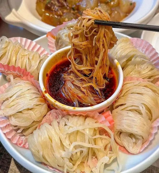 用筷子夹起一绺,蓬松透亮,蘸上蒜泥、醋,放进嘴里,油香而不腻,软乎乎的像在吃云朵,越嚼越有面香,不愧是老陕的“舌尖上的艺术品”!