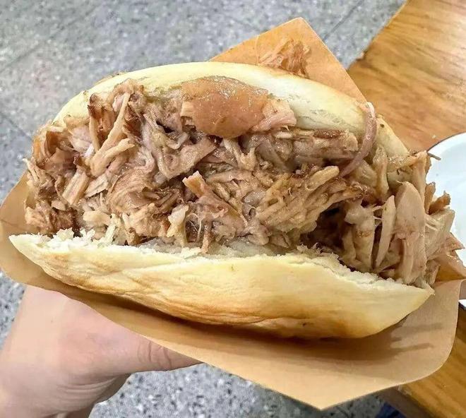外皮酥脆的白吉馍,从中间横切开,夹进炖得烂乎的腊汁肉。那肉选的是猪肋条,加八角、桂皮、香叶炖得香喷喷,肥而不腻,瘦而不柴。